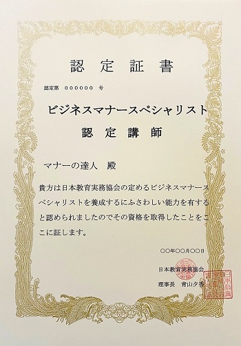 合格された方には、日本教育実務協会認定「ビジネスマナースペシャリスト」の称号と、認定証が授与されます。